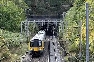 Hunsbury Hill Tunnel is a railway tunnel on the Northampton Loop Line of the West Coast Main Line. The tunnel runs in a straight line from the Briar Hill district of Northampton (north portal: 52°13′20″N 0°54′56″W / 52.2221869°N 0.915454°W), England about north by east to the East Hunsbury district south of the town (south portal: 52°12′47″N 0°55′10″W / 52.213037°N 0.9193325°W). The tunnel has a single bore with twin tracks and is 1,152 yards (1,053 m) long.[1] It is about 1 mile south of Northampton railway station and the next station south is Wolverton in Milton Keynes. The tunnel opened together with the rest of the loop line in 1881.[2]