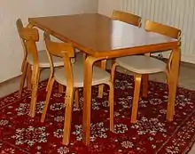 In the 1930s Huonekalu- ja Rakennustyötehdas developed a special wood bending method. Aalto used the technique extensively: his "Y-leg", introduced in 1947, and his "X-leg" that followed in 1954 are notable examples. The bent wooden parts became distinguishing features in many Aalto furniture designs, such as "Stacking Stool Model 60" and "Tea Trolley Model 98".[2]