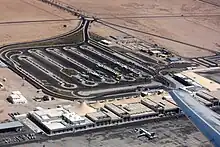 The airport currently has two passenger terminals: Terminal 1 and Terminal 2. Construction of the new terminal complex cost $335 million, which was mainly financed by the Arab Fund for Economic Development. Egypt's aviation minister, Houssam Kamal, said that the airport would be able to host up to 13 million visitors annually.[3][4] The project was inaugurated by President Abdel Fattah el-Sisi on 17 December 2014.[5] The new terminal has a total area of 92,000 square metres on three levels. The departure hall has 72 check-in counters and 20 departure gates.[6]