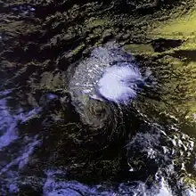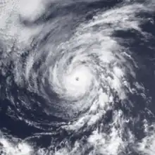 As Fefa turned more to the west, it paralleled the cooler waters, allowing the eye to remain distinct as the hurricane remained well-organized.[11] Despite moving over marginally warm sea surface temperatures and becoming involved with the Stratocumulus cloud field to its north, the hurricane restrengthened on August 4[12] to reach a secondary peak intensity of 105 mph (169 km/h) while located about 1,265 miles (2,036 km) east-southeast of Hilo, Hawai'i. After maintaining 105 mph (169 km/h) winds for about 18 hours, Fefa weakened slightly due to increasing wind shear from a cold-core trough as it entered the Central Pacific Hurricane Center area of responsibility. As the shear increased, the cyclone weakened more rapidly, and on August 6 it weakened to a tropical storm while located about 650 miles (1,050 km) east of the island of Hawaii.[8] Initially, forecasters predicted Fefa to turn to the northwest to the north of the Hawaiian Islands. However, the storm continued moving almost due westward as it steadily weakened. Aircraft reconnaissance flew into Fefa three times as it neared Hawaii. Late on August 7, Fefa weakened to a tropical depression a short distance of the island of Hawaii, and early on August 8 the depression began dissipating and degenerated into a tropical wave after moving onshore. The remnants tracked west-northwestward and passed south of the Hawaiian Islands until dissipating on August 9 to the northwest of Kauai.[13]