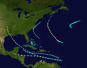 A tropical wave developed into a tropical storm just north of Barbados early on September 9.[3] Later that day, the storm crossed the Windward Islands, passing between Martinique and Saint Lucia. While moving west-northwest to westward across the Caribbean, the cyclone only strengthened slightly. Early on September 11, the storm peaked with maximum sustained winds of 45 mph (75 km/h).[4] In real time, it was believed that the cyclone curved nearly due northward on September 12 and crossed Haiti before dissipating near Great Abaco Island on September 14. However, observations from the Greater Antilles suggest that the storm continued westward.[3] Upon reaching the northwestern Caribbean on September 14, the storm weakened to a tropical depression, before dissipating about 170 mi (270 km) west of the Cayman Islands around 12:00 UTC.[4]