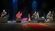 Since the group's inception, Huun Huur Tu has collaborated with musicians from many genres, such as Frank Zappa, Johnny "Guitar" Watson, the Kodo drummers, The Moscow Art Trio, the Kronos Quartet, The Chieftains and Bulgarian women's singing group, Angelite.[5][6][7][8] Their recording "Eternal" is a collaborative effort with underground electronic musician, Carmen Rizzo.[9] Huun Huur Tu appeared on three songs on Bahamut, the debut of New York-based blues group Hazmat Modine. In January 2010, Hazmat Modine also announced plans to record with Huun Huur Tu again.[10]