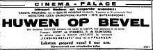 Huwen op Bevel was released in 1931,[1] although several sources list it as being from 1932.[7][8] It screened in Batavia (now Jakarta) in August,[1] reaching Medan in late September[9] and Surabaya by mid-October.[10] The film was advertised as having full sound, including music and singing. Later advertisements compared it with Tan's production, Njai Dasima.[8] It was advertised as the first sound film in the Indies and referred to as such by some later writings.[11] Biran, however, writes that Krugers's earlier film Karnadi Anemer Bangkong featured sound.[12]