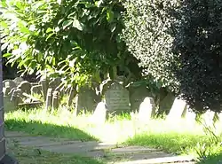 The cemetery was modelled after its human equivalent and many animals were buried under miniature headstones.[10] The gravestones are almost uniform in size being approximately 31 centimetres (12 in) high, 24 centimetres (9.4 in) wide and 5 centimetres (2.0 in) thick.[11] The gravestones are generally plain with only six surviving with any decorative elements.[11] The burial markers are typical of early pet gravestones, which remained generally small and plain until the mid-20th century.[11] Many of the graves have kerbstones and body stones, reflecting a similar trend in human burials of the late 19th and early 20th centuries.[12] The text on the headstones also mirrors human gravestones and many include the phrases "here lies..." or "rest in peace". Sleep metaphors, which first became common on human gravestones in this period, were also popular and examples include "After life's fitful slumber, he sleeps well" and "We are only sleeping, Master".[12] Some headstones are marked with bible passages and studies have cited this as early evidence of a belief that animals had souls, a belief that did not become commonplace until the later 20th-century.[13][11]
