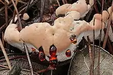 The flesh is reddish or purplish-brown with white flecks.[15] Initially spongy and soft, it becomes tough and corky as the fruit body matures. In the stipe, the flesh can become blackish in age.[18] Like other Hydnellum species, fruit body tissue is made of generative hyphae that do not expand. This slows the growth of the fruit body, often enabling it to persist for several months.[19] The fungus employs an indeterminate growth pattern, in which the fruit body formation begins from a vertical column of hyphae that eventually expand at the top to form the cap. Any solid objects encountered during growth, such as grass or twigs, can be enveloped by the expanding fruit body. Similarly, closely neighboring caps can fuse together during growth.[20]
