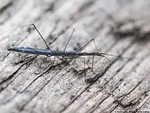 It is diurnal[8] and eats other insects, including Chironomidae (non-biting midges).[3] The female lays her eggs in May or June; they develop into nymphs and then become adults by July.[3] The name "water measurer" refers to the insects' habit of walking on the surface of ditches and ponds, apparently pacing the distances between points. Hydrophobic hairs on its legs allow it to walk on the surface of the water.[9]