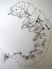 Hydropsychid larvae are unique from most Trichoptera due to their fully scleritized dorsum. Only the Hydroptilidae family share this characteristic with the hydropsychids. This feature combined with branched gills running along ventral surface of their abdomens differentiate the hydropsychids from all other trichopterans.[4] The hydropsychids have large anal prolegs equipped with hooks, allowing them to grasp the side of rocks in river and stream beds. Individuals are easily identified without the use of a lens by their large, curved bodies. In India four subfamilies (Arctopsychinae, Martynov 1924, Diplectroninae, Ulmer 1951, Hydropsychidae, Curtis 1835, Macronematinae, Ulmer 1905) have been reported so far which includes 15 genera and 128 species.