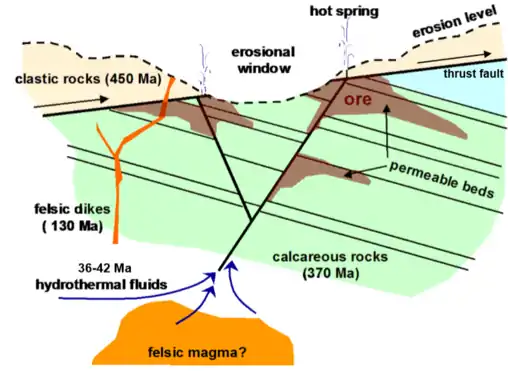 There are two main possibilities for the origin of the ore, both of which are hydrothermal:[30]