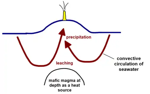 The sea water is heated, convection currents are formed and they ascend carrying the minerals which are discharged at the bottom of the sea or immediately below the surface in the form of black smokers.[37]