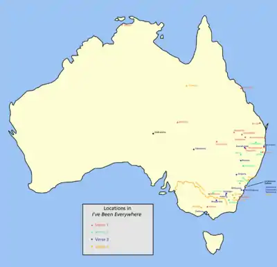Australian Peter Harris visited all the locations in the Australian version of "I've Been Everywhere" between December 2009 and July 2011. A record of his trip is online.[15]