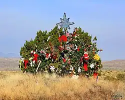 The 20-foot-tall (6.1 m) one-seed juniper (Juniperus monosperma)[3] tree was decorated annually for over 30 years[4] and is famous around the state.[5] Unlike a traditional Christmas tree, it is actually shaped like a bush, being nearly as wide as it is tall.[6] Decorations include Christmas ornaments, tinsel and garland,[4] stuffed animals, bows, flags, and it is topped with a silver star.[2] The tree is at a point where the terrain necessitated a wide separation between the northbound and southbound lanes of I-17, and the median is over 100 feet (30 m) wide. The median is under the jurisdiction of the Arizona Department of Transportation (ADOT), who have said "that for years, no one has been able to figure out who is responsible".[5] The tree is surrounded by four water storage barrels and plastic drip tubing to supplement the sparse natural rainfall in the area.[7] The irrigation system is also believed to have been installed by the unknown tree decorators.[5] In 2013, ADOT spokesman Doug Nintzel said people have told him that they know who is responsible but have not said who it is.[7]