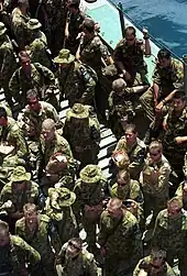The 10th Force Support Battalion had been formed on 1 March 1998 from the amalgamation of the 10th Terminal Regiment, 2nd Field Logistics Battalion, 1st Division Postal Unit and the Defence National Storage and Distribution Centre (DNSDC) Watercraft Base Repair Detachment. It was based in the Townsville area, except for the 36th Water Transport Troop in Darwin. Its sub-units included the 30th/35th Water Transport and Terminal Squadron, 26th Combat Supply Company and 2nd Equipment Company.[49] Along with its main role of providing general (third line) support to operations, the 10th Force Support Battalion had also been charged with providing fourth-line logistic support in northern Queensland. It, therefore, consisted of a mix of deployable and non-deployable components. The 2nd Equipment Company was a non-deployable unit with significant numbers of civilians, and the 26th Combat Supplies Company, which was responsible for classes of supply I (food and potable water), III (petrol, oil and lubricants (POL)) and V (ammunition), also contained many.[35][50]