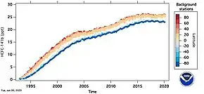 - ↑ "Long-term global trends of atmospheric trace gases". NOAA Earth System Research Laboratories. Retrieved 2021-02-11.