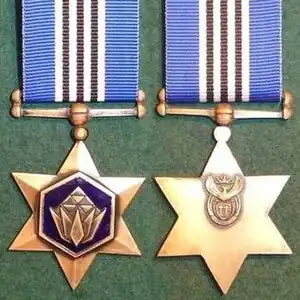 The reverse bears, in relief, the coat of arms of South Africa. The decoration is attached to a plain bronze suspender fixed to the upper point of the star. The decoration number is stamped or engraved below the coat of arms.[1]