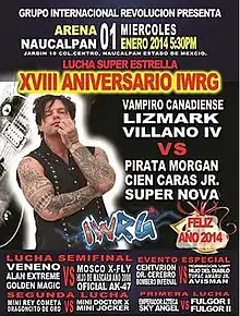 The IWRG 18th Anniversary Show was an annual professional wrestling major event produced by Mexican professional wrestling promotion International Wrestling Revolution Group (IWRG), which took place on January 1, 2014 in Arena Naucalpan, Naucalpan, State of Mexico, Mexico. The show commemorated the creation of the IWRG 18 years prior on January 1, 1996 when Adolfo "Pirata" Moreno took over running the wrestling in Arena Naucalpan and turned it into the IWRG. The main event featured the team of Lizmark, Jr., Vampiro Canadiense and Villano IV, three established wrestlers who had not worked for IWRG on a regular basis prior to the show taking on three IWRG full-time wrestlers in the team of Cien Caras, Jr., Super Nova and X-Fly. The show featured four additional matches.