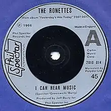 "I Can Hear Music" is a song written by Jeff Barry, Ellie Greenwich and Phil Spector[2] for American girl group the Ronettes (credited as The Ronettes Featuring Veronica) in 1966. This version spent one week on the Billboard Pop chart at number 100.[3] In early 1969, the Beach Boys released a cover version as a single from their album 20/20 (1969), peaking at number 24 in the US.