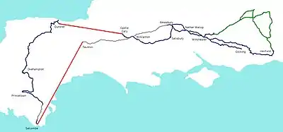 Map showing Denton Welch's travels as recounted in "I Left My Grandfather's House". Red line shows the unaccounted-for parts of the journey, grey represents journeys by car and green by train.