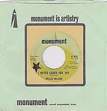Backed with "You Left Me (A long Time Ago)" on the B-side, "I Never Cared For You" was released in October 1964.[4] It became the only single that Nelson released on Monument Records.[5] The complex nature of the lyrics at the time did not favor its reception on the Country and Western market. The single flopped on the national market, while it became a local hit in Texas, enjoying major success in Houston.[6] Nelson soon after resumed talks with Chet Atkins, and left Monument to join RCA Records.[5]