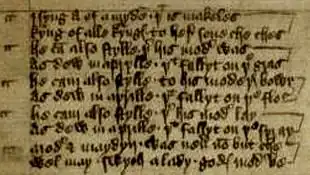 The manuscript in which the poem is found, (Sloane MS 2593, ff.10v-11) is held by the British Library, who date the work to c.1400 and speculate that the lyrics may have belonged to a wandering minstrel; other poems included in the manuscript include "I have a gentil cok", "Adam lay i-bowndyn" and two riddle songs – "A minstrel's begging song" and "I have a yong suster".[7] The Chaucer scholar Joseph Glaser notes that 2593 contains the only surviving copies of several "indispensable" poems.[8][9] These include the aforementioned poem "Adam lay i-bowndyn", "A Babe is born al of a may", "Benedicamus Domino" and "Lullay, myn lykyng".[10]