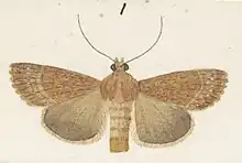 ♂. 35 mm. Head and thorax light brownish-ochreous or brownish. Terminal joint of palpi short. Antennae ciliated. Forewings elongate-triangular, costa almost straight, termen rounded, waved, rather oblique ; brownish-ochreous, more or less fuscous-tinged ; veins obscurely sprinkled with whitish, and posteriorly also with fuscous ; margins of reniform faintly indicated with whitish ; a curved transverse series of whitish dots on veins at 3⁄4 each dot preceded and followed by indistinct dark-fuscous dots : cilia light ochreous sprinkled with whitish. Hindwings fuscous, darker towards termen ; cilia ochreous-whitish, basal half suffused with fuscous.[3]