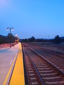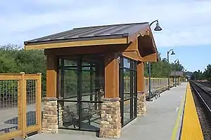 The station was designed by HNTB and split into two project phases, to be built on a former BNSF staging area. The first phase would construct a platform, two shelters, and a parking lot. The second phase would include a larger, Bavarian-style shelter, additional parking stalls, and a longer platform.[6] In May 2008, the first phase's estimated cost was revised to $850,000, with the shortfall planned to covered by private donations in a funding campaign launched by the city mayor.[39] The planned opening date of November 2008 was also delayed to September 2009.[40] By the end of the year, the city government had raised an additional $175,000 to cover the construction of the first phase.[2][41]
