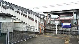This station consists of a single island platform serving two tracks, connected to the station building by an overhead passageway.