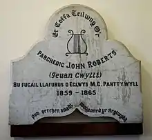 Ieuan Gwyllt was the bardic name of Welsh musician and minister John Roberts (22 December 1822 - 14 May 1877). His bardic name is derived from the pen name he used whilst writing poetry as a boy, Ieuan Gwyllt Gelltydd Melindwr (John of the Wild Woods near the Mill Tower).[1] He was born at Tanrhiwfelen, a house just outside Aberystwyth, and died in Caernarfon on 14 May 1877. He was buried at Caeathro cemetery near Caernarfon.