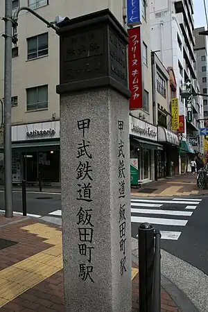 Iidamachi Station was operated by Kōbu Railway, Japanese Government Railways, Japanese National Railways and Japan Freight Railway Company (JR Freight). Its location was 0.5 km from Suidōbashi Station and 0.4 km from Iidabashi Station.