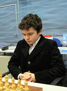 - ↑ In the last decisive game with Daniele Vocaturo he had a winning position, but did not see a variation that permitted a perpetual check, which allowed Vocaturo to maintain his half point lead, thereby winning the tournament.