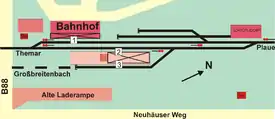 There are currently two platforms with 3 platform faces in Ilmenau station. Platform 1 (the "house" platform) is used for travel to Erfurt, while platforms 2 and 3 (sharing an island) are no longer used by scheduled services. Steam excursions to Rennsteig operate from platform 2, but platform 3 (a bay platform) is currently not used. Two other tracks were used for freight operations to the east of the three platform tracks. These were removed about 2002, but the loading ramp is still easily recognisable. Many tracks were also formerly operated in the north-eastern part of the station for marshalling and freight traffic. Three factory sidings branched off directly from the station: one ran to the slaughterhouse, another to the Porzellanfabrik Galluba & Hofmann (porcelain factory on Neuhäuser Weg) and the third ran for about two kilometres to the Graf von Henneberg Porzellan Ilmenau (another porcelain factory). It was laid down only in 1973 and included another freight yard with several tracks to the north of the station. The construction of a new freight yard started in the 1970s, which was located to the east of the station on Neuhäuser Weg. In 2006, there was a large open-air area with railway tracks and station lighting systems. It is planned to convert the area into a commercial area.