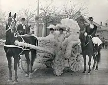 Hogg and an unidentified woman are seated in a horse-drawn carriage, decorated with flowers for the Tekram parade, part of Houston's No-Tsu-Oh festival.