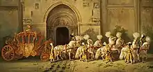 The Imperial Coach (in German: Imperialwagen) is the golden carriage that was used at the Imperial and Imperial Austrian court in Vienna. It is now kept in the Imperial Carriage Museum at Schönbrunn Palace.[1]