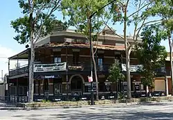 A two-storey corner hotel in brickwork and cement render with verandah to the street frontage at the first floor level having cast iron lace balustrading and cast iron columns. The hotel abuts the corner, with a beer garden to the southwest alongside North Avenue, and car parking area to the north facing Rooty Hill Road. A number of additions have been made to the rear of the building over time, including a single storey section that has been altered, along with a c.1995 addition which infilled the courtyard facing North Parade which created a bistro at the rear.[5][1]