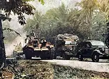 Japanese armor was also lacking. During the interwar period, Japan bought various Vickers 6-Tons, and largely modelled their own tank designs after them, but the effectiveness of such tanks was very limited. Japanese tanks were mostly used for reconnaissance and supply purposes as they were ineffective in direct combat against other tanks.[42] Neither the light Type 95 Ha-Go nor the medium Type 97 Chi-Ha could penetrate an M4 Sherman frontally.[43] Furthermore, while the United States Marines deployed twelve M3 half-tracks per battalion, while these vehicles were originally designed as tank destroyers, in the Pacific they were predominantly used as artillery, since Japanese tanks were so infrequently encountered.[44] American light tanks such as the M5 Stuart and medium M3 Lee, while considered inadequate in Europe, were deployed in the Pacific, as they were sufficient in dealing with the Japanese.[45]