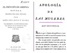 "Apología de las mujeres" is an essay that Joyes dedicated to her daughters, and that she wrote in epistolary mode as an appendix to her translation of Rasselas, Prince of Abissinia. It deals with the situation of women in their time, denouncing the poor education they received, the inequality and double standards that they observed in society.[1]
