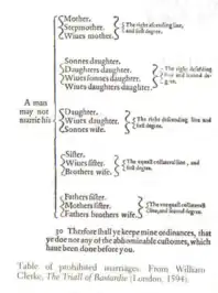 Table of prohibited marriages from The Trial of Bastardie by William Clerke. London, 1594