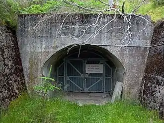 The secret site was officially called "Inchindown, Royal Navy Fuel Tanks" and also known as the "Invergordon Oil Fuel Depot".[3] The complex consists of six tanks: five are 237 metres (778 ft) long, 9 metres (30 ft) wide, with arched roofs 13.5 metres (44 ft) high; a smaller sixth tank is of the same height and breadth but shorter.[4] Work on the tanks began in 1938 and was completed in 1941. They were built to be a bomb-proof supply of furnace fuel oil to the Royal Navy's base at Invergordon.[1]