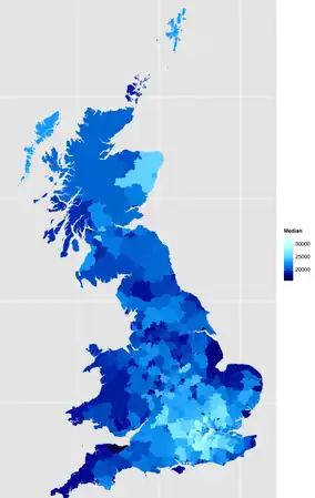 The most recent SPI report (2012/13) gave annual median income as £21,000 before tax and £18,700 after tax.[6] The 2013/14 HBAI report gave median household income (2 adults) as £23,556.[8] The provisional results from the April 2014 ASHE report give median gross annual earnings of £22,044 for all employees and £27,195 for full-time employees.[7]