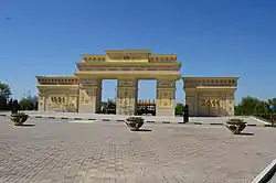 The Independence Park (Kazakh: Тәуелсіздік саябағы, Täuelsızdık saiabağy) is an urban park in the city of Shymkent, Kazakhstan. It was opened in October 2011 as an honor to the 20th anniversary of Independence Day.[1] The central entrance to the park is decorated with an arch and inside the territory, is a singing fountain, numerous flower arrangements, plants for which were brought from the Netherlands. In the center, there's monument named Altyn Shanyraq which represents the unity of Kazakhstani people which was created from 137 metal elements symbolizing 137 nationalities living on the territory of the Republic of Kazakhstan. A large flag pole is installed in the park with a height of 50 meters. A large iron pedestrian bridge connects the park to the Ordabassy Square, symbolizing the transition from the historical past of the city to its modern history.[2]