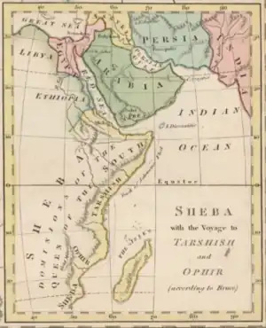 1 Kings 9:26–27 discusses the navy of King Solomon sailing to Ophir ("Sopheir" and "Sophara" in the LXX), with the word Sophir meaning India in Coptic; as gold was plentiful in India, "it is generally accepted that Ophir was a port in India".[1] 1 Kings 10:22 mentions "gold, silver, ivory, apes, and peacocks" brought by the navy of King Solomon and King Hiram to Israel.[1] In the Old Testament, the word for peacock tuki, the word for ivory shen habbim, and the word for ape kof are likely "derived from their Indian counterparts tokei, ab, and kapi, respectively."[1] Proverbs 7:17, Psalms 45:8, and Song of Solomon 4:14 reference the Indian fragrant wood aloes, which in the Hebrew is ahalim, being derived from the Sanskrit agaru.[1] Contemporary Babylonian texts use the word sindhu (meaning "Indian") for linen, as with Greek texts that use the word sindon for the same.[1]