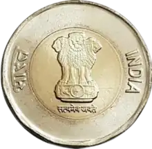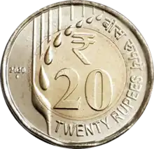 The Indian 20-rupee coin (20) is a denomination of the Indian rupee. The ₹20 coin is the highest-denomination circulation coin minted in India since its introduction in 2019. The present ₹20 coin is released for circulation. The release of the coin was supposed to be in March 2020, but it was shifted to May 2020 because of the COVID-19 lockdown. This is used alongside the 20 rupee banknote.[1][2] This coin was released in May 2020 along with the new series of the rupee coins.