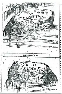 In 1894, a rough illustration of the Indian Head Rock appeared in a Portsmouth newspaper. In the sketch, initials, last names with first initials, and a crude house figure are seen. All of these features are extant on the boulder, but many are now obscured by additional engravings which may not have been present at the time. The rock is depicted several feet from the Kentucky shoreline with the bottom submerged. The "Indian Head" face is depicted just below the waterline, but it is clear the illustrator had not seen the actual face, as it is drawn as a profile. Some of the names shown on the rock are identified with historically prominent Portsmouth residents or families, e.g., F. Kinney, C. Molster and D. Ford.[17]