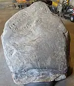 The Indian Head Rock is an eight-ton sandstone boulder, which had rested at the bottom of the Ohio River,[1] until September 2007 when it was retrieved by a group of local divers, led by amateur historian Steve Shaffer[2] of Ironton, Ohio. The recovery of the perennially submerged rock, which was the subject of local lore since the 1800s, was celebrated by Ohio and Kentucky residents in the months that followed. City of Portsmouth, Ohio officials had planned to display the Indian Head Rock in a manner appropriate for the preservation of the historic boulder. However an ensuing interstate dispute led to charges being brought against Shaffer and his fellow divers and a suit demanding the rock be returned to Kentucky. Legal issues were resolved in 2010 and the rock was returned. From 2010 to 2020, the rock was stored in a county highway maintenance garage. In September 2020 it was placed in a small roofed structure enclosed with chain link fencing,[3] despite ongoing concerns that it should be protected in a climate-controlled structure.[4]