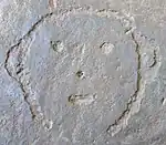 The Indian Head Rock originated as part of "Quaternary Pleistocene and Recent Landslide deposits" from the Kentucky hillside facing the city of Portsmouth. The landslide deposits consist of "unconsolidated angular boulders and finer debris; found at base of steep slopes along Ohio River."[12][9] An early account of the Indian Head Rock (1891) stated that "The rock is not of the freestone formation of the river bed at this point, but is a hard sandstone, and must have rolled from the top of the hill in remote ages. The face was probably made to commemorate the lowest water ever known in the Ohio river since white men settled upon it." At that time there was already "a multitude of...names and characters, evidently quite ancient" carved in the rock.[13]