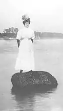 In October 1920, or shortly before, a passing steamboat damaged the downstream dam (No. 31). The incident coincided with an unusually low water level in the Ohio River. As a result, the Indian Head Rock was exposed for the first and only time since the completion of the dam until the rock's recovery in 2007. The boulder's reappearance drew the attention of Portsmouth attorney, business, and former US Congressman Henry T. Bannon (1867-1950). The rock was only partially exposed with the carved face remaining underwater. Bannon described his encounter with the historic rock in a paper published the journal of the Ohio State Archaeological and Historical Society. This description is the first known scholarly discussion of the artifact. Bannon reported that "As no picture or accurate description of the Indian's head [i.e., the carved face, rather than the rock itself] was in existence, my brother, Arthur H. Bannon, determined to secure a photograph of it, if possible. On October 22, 1920, the top of the sculpture was about six inches beneath the surface of the river so a plan to bring it into view for a photograph had to be devised. That was accomplished by running a motor boat past the rock at very fast speed. As the boat drew the water away from the rock, a photograph was obtained of the sculpture. The difficulties in the way of a clear photograph were many, for the photographer was obliged to stand in the water and take the picture instantaneously, when the water was at its lowest ebb, and while water was still running down the side of the rock." Several attempts were required to get a good photo. Bannon's paper described some inscriptions on the rock that had been unknown previously. Bannon concluded that "Such was the only time, within the memory of any living man, that the Indian's head has been seen, except when covered with water. In all probability neither the Indian's head, nor the rock upon which it is cut, will ever be seen again, as it is hardly within the realms of chance that the dam will be broken at such an opportune time." The photo that the pair took so industriously and a photo of Bannon's party posing with the rock were published along with the paper.[24]
