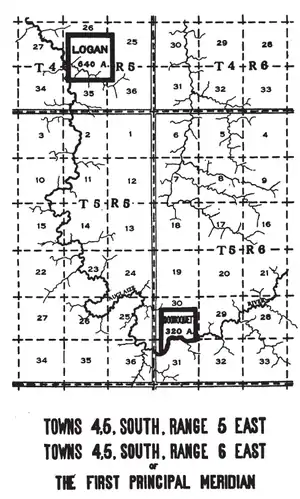 In 1786, during Logan's Raid, General Benjamin Logan of Kentucky took a number of hostages, including a Shawnee youngster named Spemica Lawba, who came to be known as Captain Logan. He was later exchanged and returned to his own people, and became a chief. He scouted for the Americans in the War of 1812 and died after a skirmish.[5] The Treaty of Fort Meigs granted Captain Logan's surviving children 640 acres on the east side of the Auglaize River, T4S R5E of the First Principal Meridian, in Auglaize County, Ohio.[6]