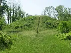 Local residents are believed to have dug around the mound around the turn of the twentieth century, but little damage appears to have been done. In the early 1970s, its dimensions were reported as being 150 feet (46 m) in diameter by 27.5 feet (8.4 m) in height; its decrease in height may have been the result of differing measurements,[4]: 547 as in 1848, the Greene County surveyor had reported its measurements as 30 by 140 feet (9.1 m × 42.7 m).[7]: 34 More recent archaeological studies of the site have concluded that it was constructed as a burial mound by people of the Adena culture in the final centuries before Christ. While the mound has never been scientifically excavated, its great size suggests that its construction took place over an extended period of time, leading archaeologists to conclude that it may contain evidence of multiple stages of Adena society as well as in the mortuary traditions practiced on those buried in the mound.[4]: 547