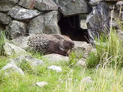 The Indian crested porcupine is semifossorial.[2] They live in natural caves or in excavated burrows.[20][21] Because they do not climb or jump well, they spend most of their lives on or under the ground.[4] However, they are good swimmers.[4]