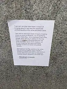 Note on the side of the Lincoln statue's base with an excerpt from his remarks at Charleston during the Lincoln–Douglas debates