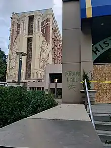 Boarded exterior and mural damage following vandalism to the Oregon Historical Society